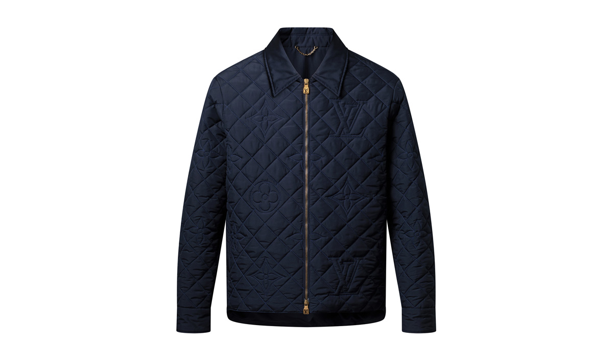 キルティング加工を施したエレガントなミッドナイトブルーのオーバーシャツ。テクニカル素材にあしらった同系色のモノグラム・マクロ モチーフの刺繍がモダンなアクセントを加える。