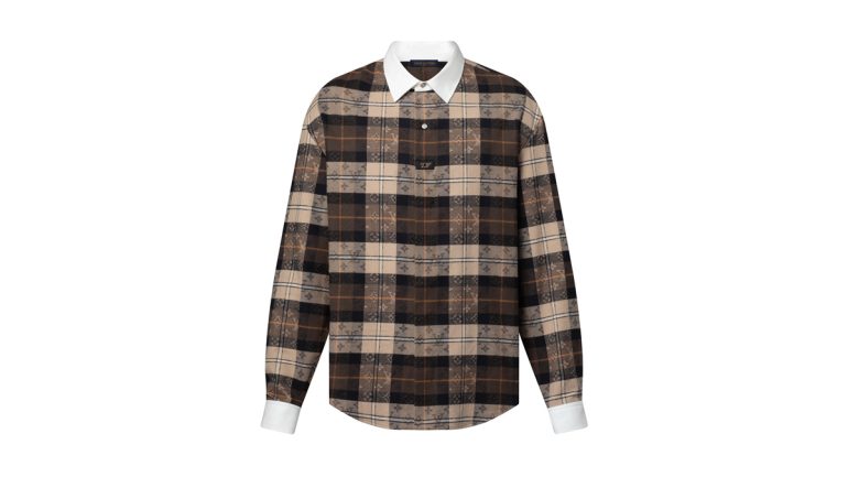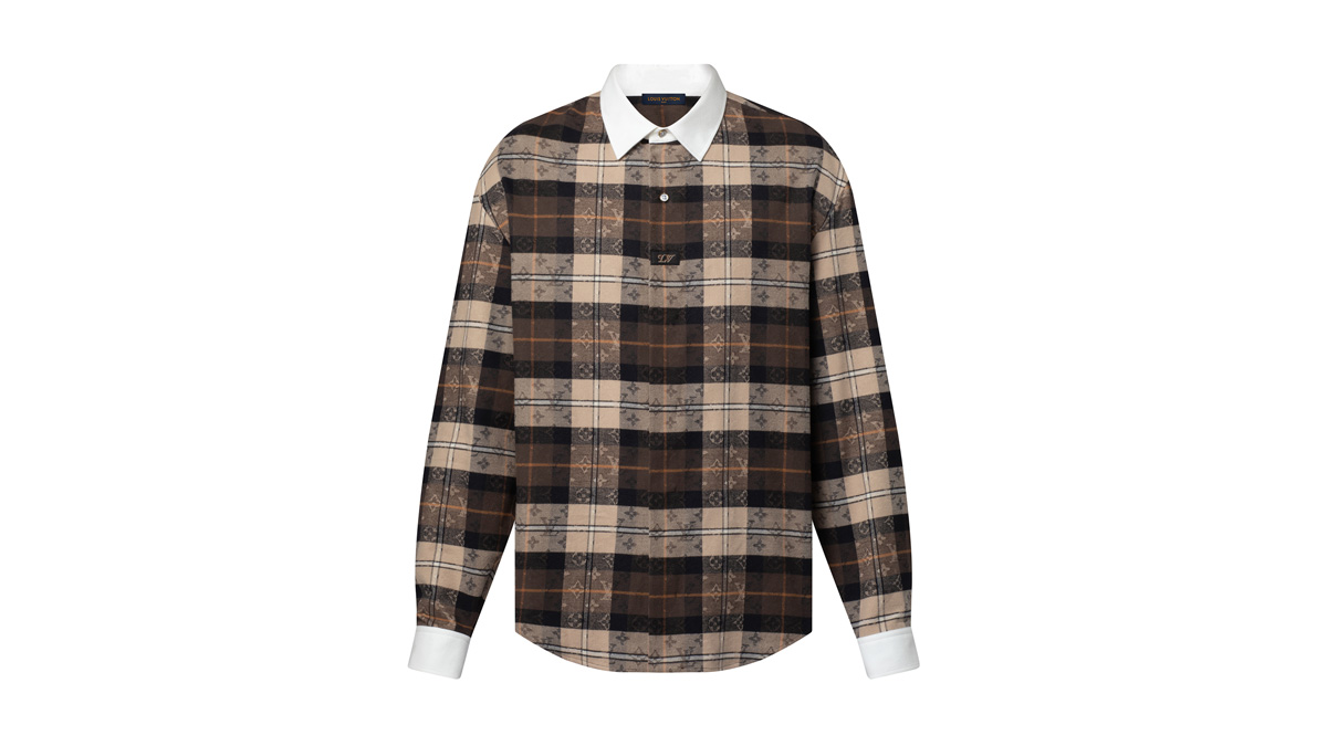 比翼仕立ての開閉部には、ハーフボタンプラケットを想わせる2つのマザー・オブ・パール風ボタンと織り上げたLV パッチをあしらい、襟元と袖口にはホワイトのコットンポプリンを使用している。