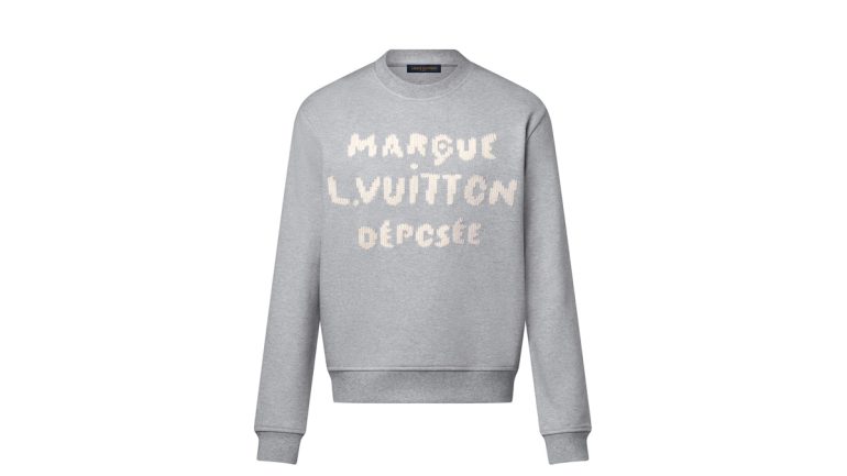 前面にコントラストを効かせたホワイトの「Marque L. Vuitton Déposée」シグネチャーを大きめのステッチで遊び心たっぷりに刺繍し、手編みのようなトロンプ・ルイユ(騙し絵)風の効果を演出。背面にも同じ技法でLVシグネチャーを添えた。