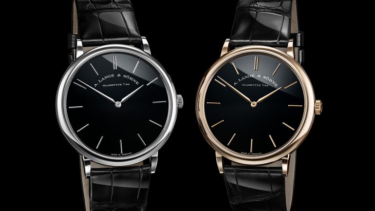 そのサクソニア・フラッハに、ジェットブラックのオニキスダイヤルを備えたハニーゴールド750製と、プラチナ950製の洗練された二つの特別モデルが加わった。どちらのモデルも200本限定。