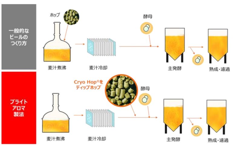 2つめの特徴は製法だ。キリンはホップを麦汁の発酵中に投入する「ディップホップ製法」という独自製法をもつ。これを「グッドエール」に応用。ホップの香りを存分に引き出すために、クライオホップを発酵中に漬け込み、その後に濾過する「ブライトアロマ製法」を採用した。これにより雑味を抑えられ、よりクリアでフレッシュな味わいが生まれる。