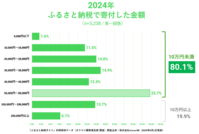 ふるさと納税サイトの利用者3,238人に対し、「2024年ふるさと納税で寄付した金額(単一回答)」について聴取したところ、「50,000円~99,999円」が25.7%で最多となった。