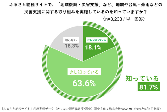 ふるさと納税サイトの利用者に「ふるさと納税サイトで、地域復興・災害支援など、地震や台風・豪雨などの災害支援に関する取り組みを実施しているのを知っているか?(単一回答)」と聴取したところ、「詳しく知っている(18.1%)」「少し知っている(63.6%)」を合わせると81.7%の人が「知っている」と答えた。