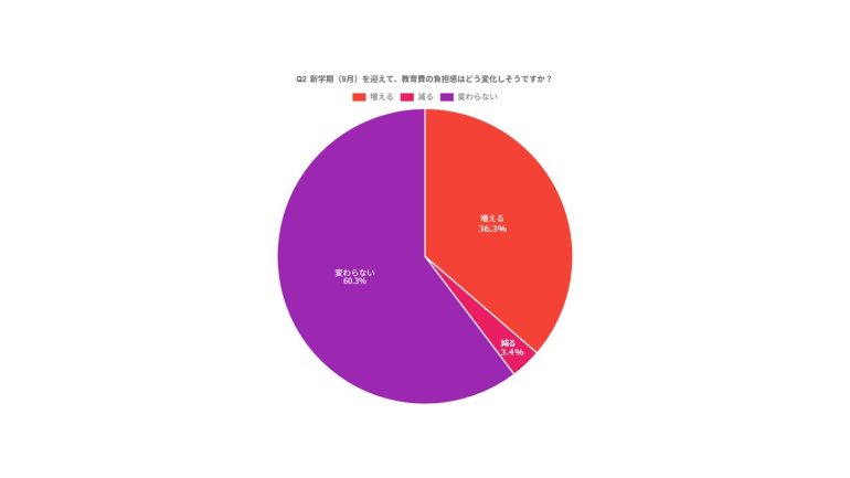 9月の新学期を迎え、36.3%の親が「教育費が増える」と回答。学校生活の再開に伴う教材購入や習い事再開、さらには受験対策の強化など、新たな出費が重なる時期でもある。反対に「減る」との回答はわずか3.4%にとどまり、教育費の見直しや削減には消極的な家庭が多いことが明らかに。教育は“コストカットできない分野”という意識が色濃く見られる。
