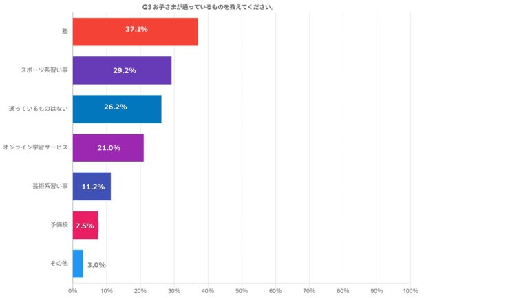 子どもが通っている教育・習い事については、「塾」が37.1%で最多。次いで「スポーツ系習い事」(29.2%)、「オンライン学習サービス」(21.0%)となった。複数回答が可能なため、1人の子どもが複数の活動に参加しているケースも多く、教育や成長機会の多様化が顕著だ。