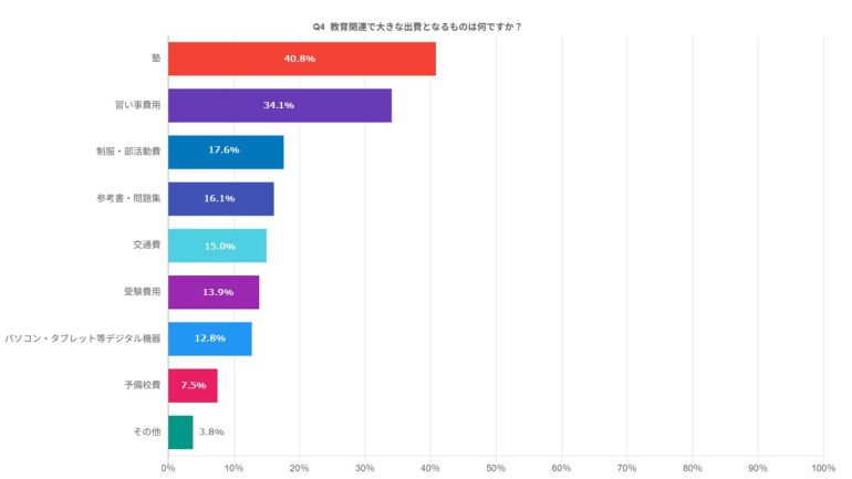 教育関連で最も家計に響く出費は、「塾」(40.8%)と「習い事費用」(34.1%)が上位を占めた。受験や学力アップのための塾通いに加え、スポーツ・音楽・芸術といった“非認知スキル”への投資も盛んだ。