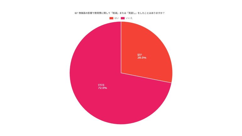 物価高の影響により、28.0%の親が教育費の削減や見直しを経験している。多くは「塾や習い事の見直し」が中心で、家計の負担増を受けた苦渋の選択がうかがえる。しかし、72.0%の親は「削減しない」と回答しており、教育への投資を優先している実態も明らかだ。