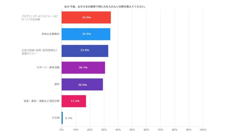 今後力を入れたい分野としては、「プログラミング・ICTリテラシーなどIT・デジタル分野」(34.9%)「学校の主要教科」(34.4%)「お金の知識・投資・経済理解など金融リテラシー」(33.0%)」が上位を占めた。変化の激しい社会に対応できるよう、親世代も“これからの時代に必要な力”を意識して教育方針を見直しているようだ。単に「良い点数を取る」だけでなく、“生きる力”を育む教育を重視する傾向が高まっているように見受けられる。