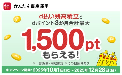 「d払い残高積立」では、2025年10月1日~12月28日にキャンペーンを実施する。キャンペーンでは、毎月10万円の積立をすることで、dポイントが月500ポイント、合計1,500ポイントもらえる。