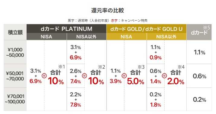 dカードでの積立では730ポイント < dカードでの積立(7万円、670ポイント)+「d払い残高積立」(3万円、150ポイント)合計820ポイント
