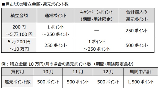 キャンペーンペーン期間中は、通常ポイントである月5万円までの積立額ポイント(上限 250 ポイン ト)に加えて、キャンペーンポイントとして月5万200円~月10万円の積立でも追加ポイントがもらえる。