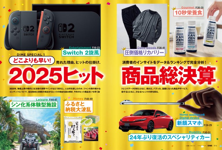 2025年、物価上昇の時代に生活者の消費マインドはどう変化し、人は何を欲したのか。ジャンル別の様々なトレンドデータ分析とともに、売れた、バズった、話題になった商品やサービス、コンテンツについて、各社取材とDIMEの視点からヒットの理由を読み解き。今年のヒット商品をいち早く総括するとともに、次なるトレンドの芽を探る。