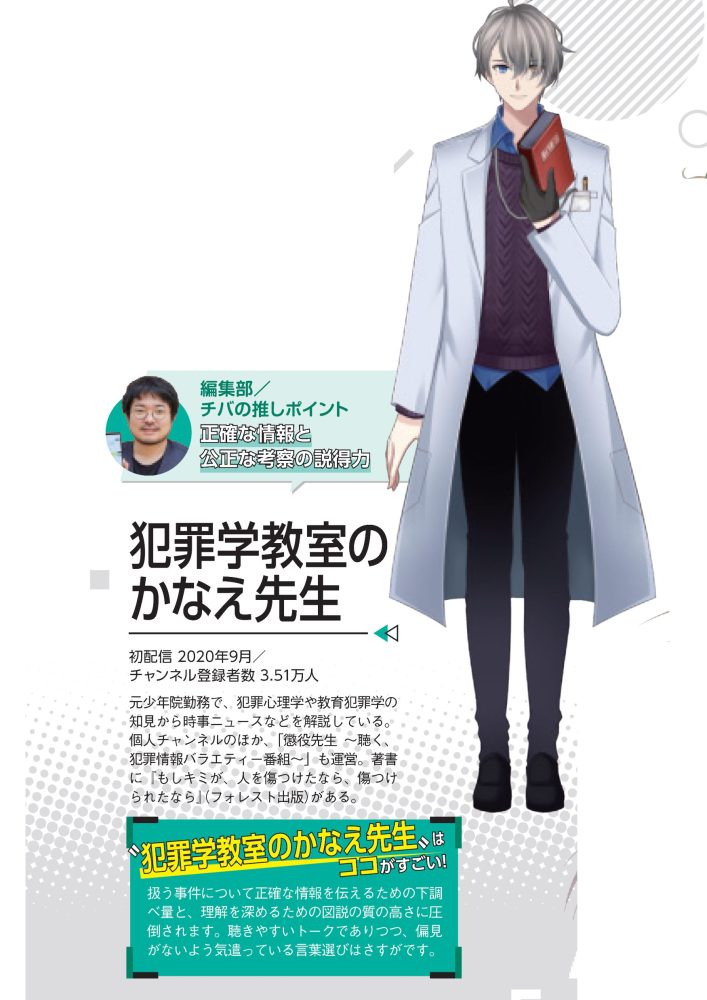 VTuberという活動スタイルはすでに広く定着し、ゲーム配信や雑談にとどまらず、活動の幅は多様化している。その一つが「特化型VTuber」だ。自身の知識や経験を活かし、専門領域の〝語り部〟として活動するVTuberを指すが、その第一人者として真っ先に名前が挙がるのが、犯罪学教室のかなえ先生だろう。