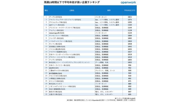 中小企業を含むすべての企業に働き方関連法による「時間外労働の上限規制」が適用されてから約5年半が経過した。残業時間の削減など労働環境の改善は広がりを見せているが、「短時間で成果を上げる仕組み」を持つ企業とそうでない企業の差は広がっているという。高い給与水準を維持しながら残業時間を抑えられる企業は、どのように生産性を高めているのか? 実際に働いた経験に基づく社員・元社員の声を共有できる転職・就職のための情報プラットフォーム『OpenWork』は、もっとも閲覧数の多いコンテンツのひとつである「年収情報」をもとに、2023年に『OpenWork』上に投稿された残業時間の平均である「23時間」以下の企業に限定して、平均年収の⾼い上位30社から働きやすさと⾼い年収を両⽴する企業の共通点を分析した結果を公開した。なお、2023年以降の『OpenWork』上の投稿された対象企業数は6456社。