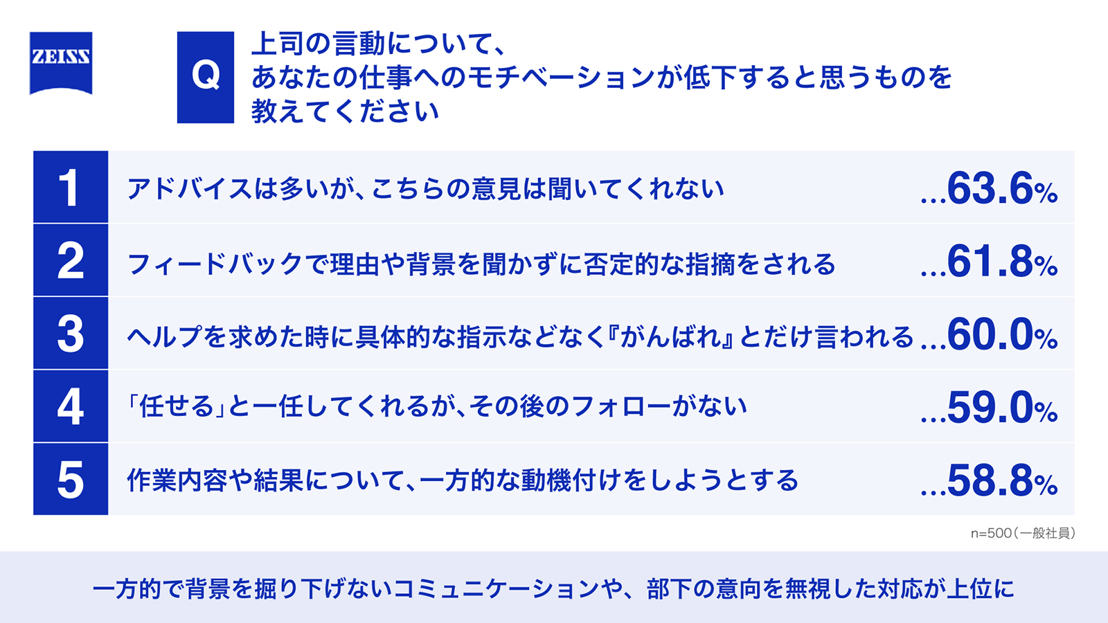仕事へのモチベーションを低下させる上司の言動についての質問では、6割以上が「アドバイスは多いがこちらの意見は聞いてくれない」と回答。2位以下も「フィードバックで理由や背景を聞かずに否定的な指摘をされる」や「ヘルプを求めた時に具体的な指示などなく「がんばれ」とだけ言われる」といった否定的な言葉や抽象的な言葉による対応だった。一方的で背景を掘り下げないコミュニケーションや部下の意向を無視した対応は、アドバイスやフィードバックの内容が的確でも「聞いてくれない」や「説明してくれない」と部下のやる気を削ぐ可能性があるという。