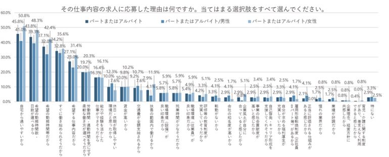 求人に応募した、パートまたはアルバイト雇用を希望する人に、自身が応募した求人を選んだ理由をきいた(複数回答)。最も多かったのは「自宅から通いやすいから」で45.8%、次いで「希望の勤務時間数・日数が選べるから」が43.8%、「希望の勤務時間帯だから」が37.1%となった。限られた時間の中で就労をしたいことから、通いやすさも同時に意識していることがわかる。