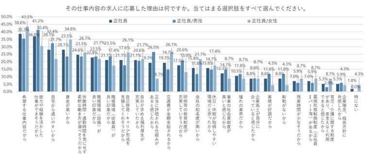 性別との関係をみると、「男性」のほうが「女性」よりも「正当に評価される仕組みがあると感じたから」が17.8pt、「能力や経験を活かした仕事ができそうだから」が10.8pt、「自宅から通いやすいから」が10.7pt高くなった。自身の持つ力を発揮しつつ、評価につながる環境を探している人が多いようだ。