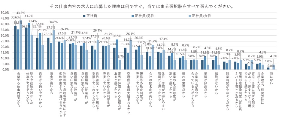 求人に応募した、正社員雇用を希望する人に、自身が応募した求人を選んだ理由をきいた(複数回答)。多かったのは「希望する仕事内容だから」が38.6%、「能力や経験を活かした仕事ができそうだから」が36.8%、「自宅から通いやすいから」が28.1%となった。