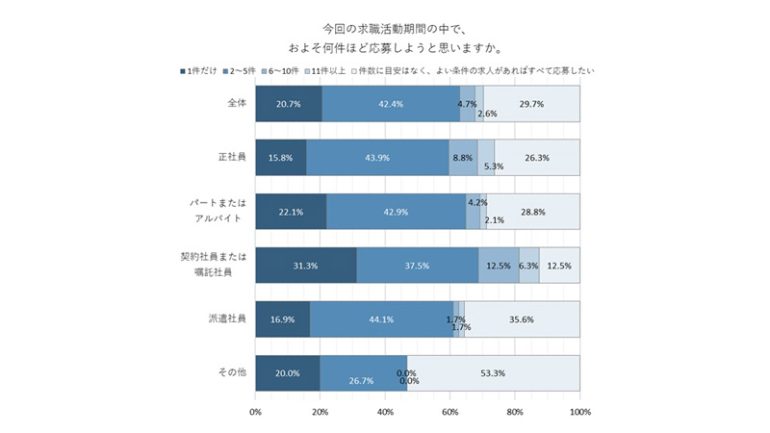 求人に応募した人に、今回の求職活動期間の中で、求人に応募する件数の目安があるかどうかを聞いた。全体では、「2~5件」が最も多く42.4%、次いで「件数に目安はなく、よい条件があればすべて応募したい」が29.7%、「1件だけ」が20.7%、「6~10件」が4.7%、「11件以上」が2.6%となった。「1件だけ」以外を選んだ割合は全体の約8割となった。