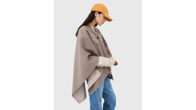 肌触りのよいウィメンズのポンチョは、ブランケットとしても、ボタンを留めてアウターとしても使用できる。
