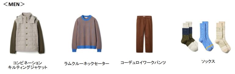 バイカラーのヘリンボーン柄ラムクルーネックセーターはジェンダーレスに楽しめるアイテムだ。毎シーズン、カラーリングとプレイフルなデザインが好評のヒートテックソックスは5型計10色をラインナップ。