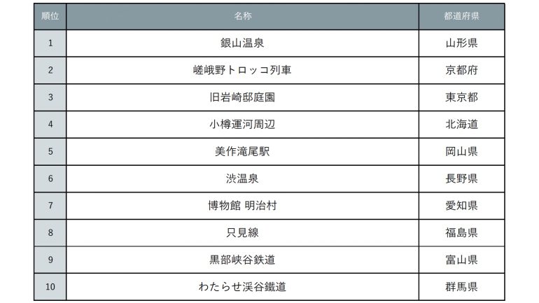 そのほかTOP10には、駅舎や温泉街など懐かしさを感じるレトロスポットに紅葉が彩りを添え、ロマンティックな景色が楽しめる場所が多数ランクインした。秋の旅先選びに、このランキング情報をぜひ活用していただきたい。