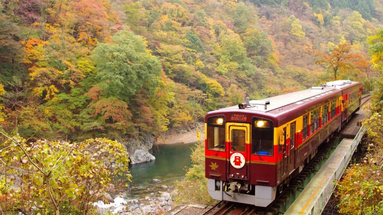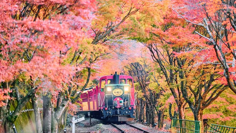 嵯峨野トロッコ列車では、保津川渓谷を走る列車から紅葉の渓谷美を堪能できる。木製の座席や裸電球がともるレトロ感漂う車両でゆったりと進行。車窓からは赤や黄に染まる山々が広がり、秋の風景を存分に楽しめる。夜間には沿線がライトアップされる「光の幻想列車」が運行され、昼間とは異なるロマンティックな景色を見ることができる。
