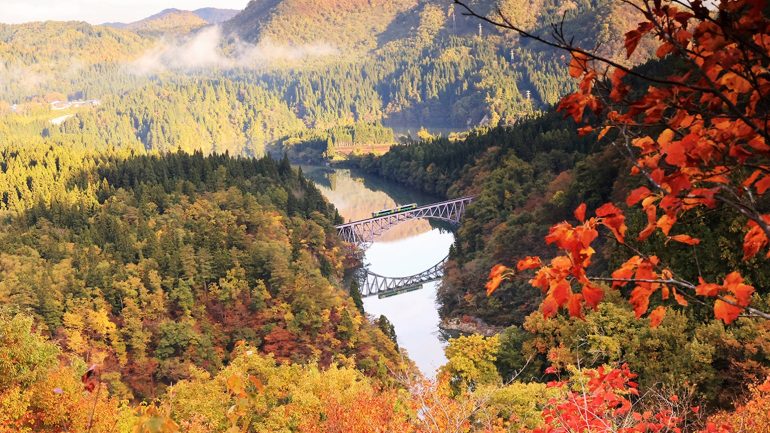 只見線の紅葉は、列車から眺める奥会津の自然美あふれる絶景が最大の魅力となっている。只見川に沿って走る路線では、秋の彩りに包まれた山々と川霧が織りなす幻想的な風景が見渡すことができる。特に「第一只見川橋りょう」における鉄橋と紅葉、川の流れが一体となった景観は感動的。秋の臨時運行「風っこ只見線満喫号(※全席指定・要事前予約)」は、窓が大きく開くトロッコタイプなので、昔ながらの鉄道旅の雰囲気を体感できる。