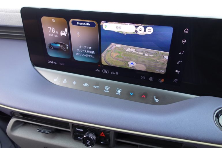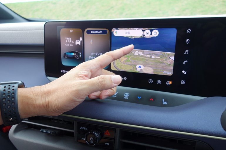 13.3インチの大型デュアルディスプレイは今どき驚くほどではないが、気が利いているのはGoogle搭載の日産コネクトインフォテイメントシステムをタッチ操作する際、インパネ中段のソフトパッドで覆われた平面部分がリストレストのように手を固定して操作できるように配慮されていること。より確実で安定したタッチ操作が可能になるというわけだ。