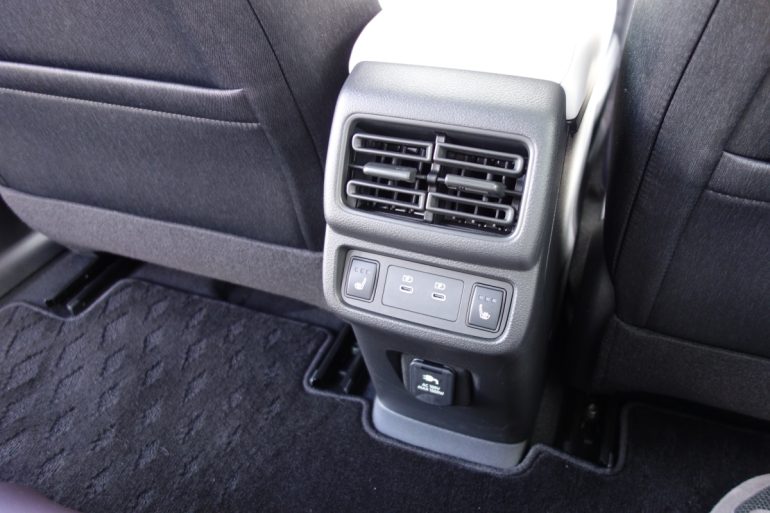 ただし、先代同等の車両本体価格を目指したためだろうか、インパネ下部、乗員の膝下部分は硬質なプラスチック素材でまとめられ、質感の高いインパネ上部との落差はけっこうある。とくにシフター(P/R/N/D)、D-MODE(ドライブモード)、e-Pedalなどのスイッチ類が並ぶ面もまたプラスチッキーで、なおかつD-MODE(ドライブモード)のスイッチが小さく、素手でも操作性は運転席からの距離を含めよいとは言えず、厚手の手袋をしていたら操作しにくいのでは?なんて思わせる。