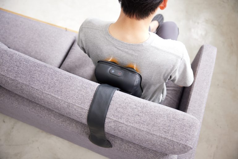 もちろん、座りながら使用することも可能で、付属のもみ位置調整ベルトをソファや椅子の背もたれにかけると、肩甲骨・首・腰など好みの位置に固定でき、ピンポイントにマッサージできる。