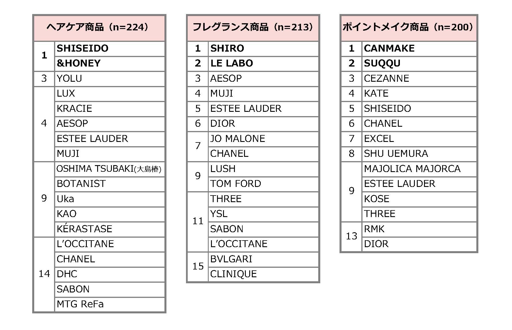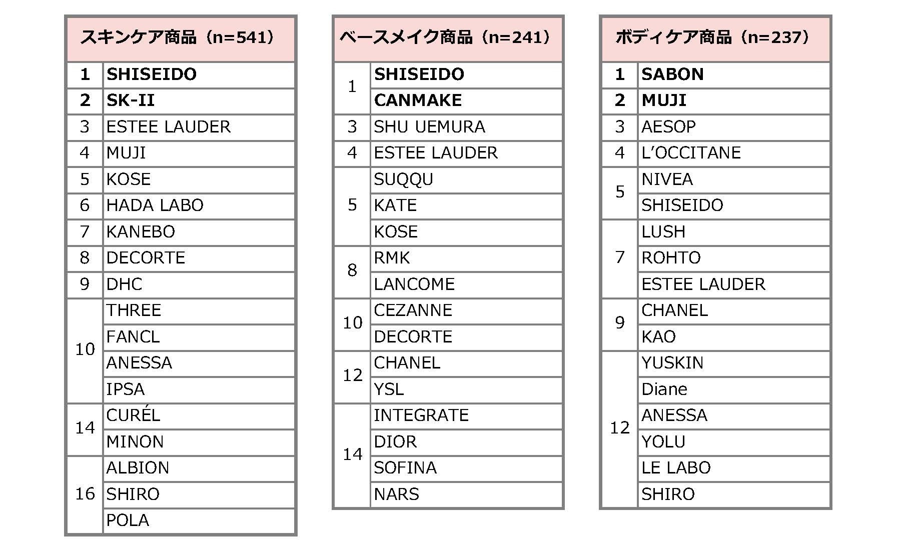 日本で「スキンケア商品」「ベースメイク商品」「ボディケア商品」「ヘアケア商品」「フレグランス商品」「ポイントメイク商品」をそれぞれ購入したいと回答した人に対し、具体的なブランド名を自由回答形式で質問したところ、全6カテゴリーのうち、資生堂が「スキンケア商品」「ベースメイク商品」「ヘアケア商品」の3カテゴリーで1位となった。また、無印良品が「スキンケア商品」で4位、「ボディケア商品」で2位、「ヘアケア商品」で他4ブランドとの同率4位、「フレグランス商品」で4位となり、訪日客に化粧品ブランドとして一定の認知があることが示された。このほか「ベースメイク」で資生堂と同率1位となったCANMAKEは「ポイントメイク」でも1位を獲得した。