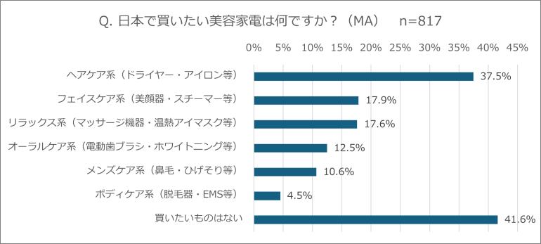 回答者全員に、日本で買いたい美容家電について、複数回答形式で質問したところ、1位は「ヘアケア家電」(37.5%)。2位は「フェイスケア家電」(17.9%)、3位はマッサージ機器などの「リラックス家電」(17.6%)となった。また、「買いたいものはない」との回答が41.6%だったことから、全体の半数以上となる58.4%が「日本で美容家電を買いたい」ことが示された。