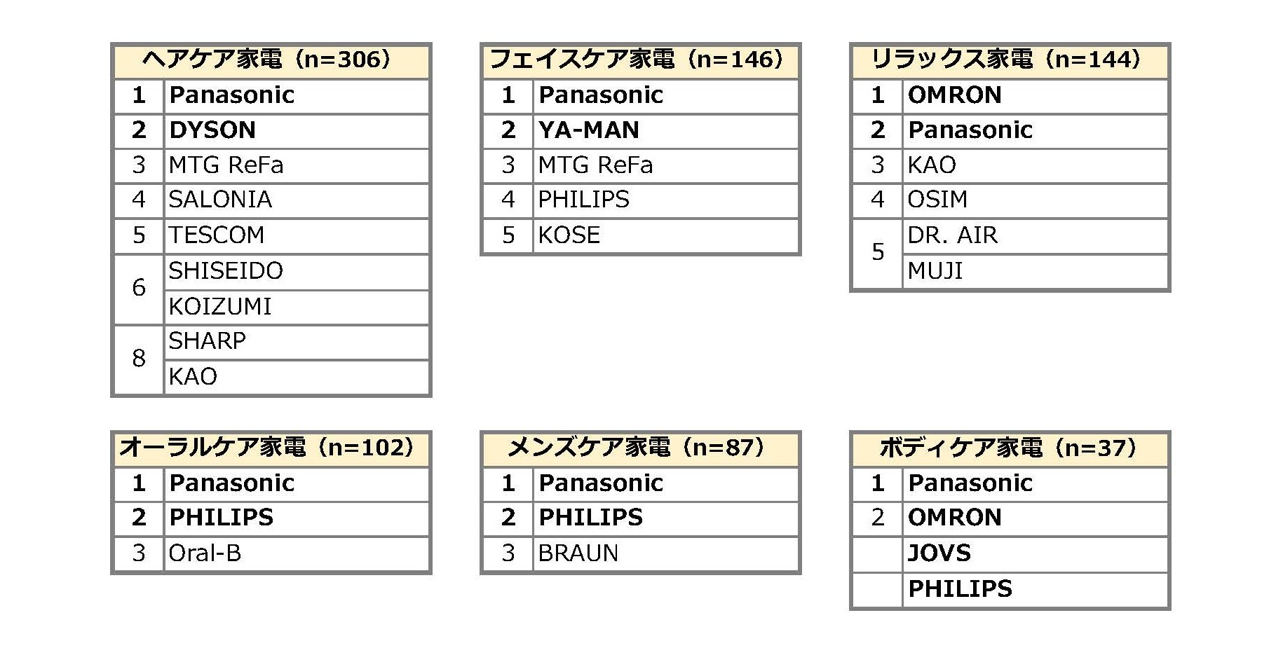 日本で「ヘアケア家電」「フェイスケア家電」「リラックス家電」「オーラルケア家電」「メンズケア家電」「ボディケア家電」それぞれを買いたいと答えた人にブランド名を、自由回答形式で聞き集計したところ、パナソニックが全6カテゴリーのうち「ヘアケア家電」「フェイスケア家電」「オーラルケア家電」「メンズケア家電」「ボディケア家電」の5つで1位を獲得。残る「リラックス家電」の1位はオムロンだった。