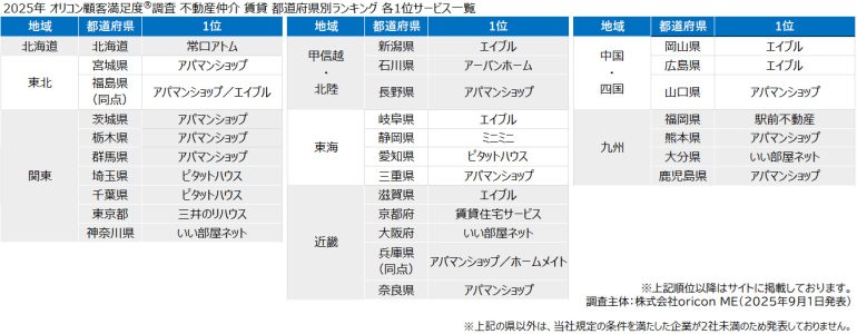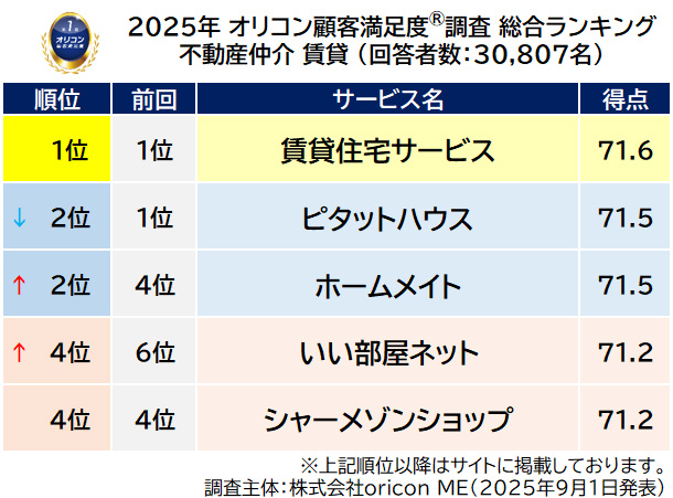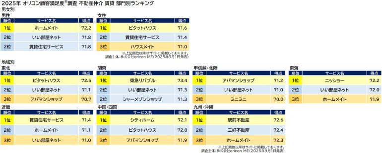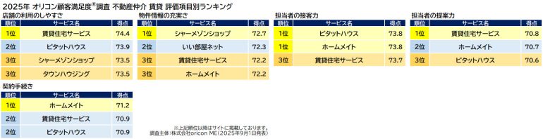 オリコンはこのほど、グループ会社であるoriconMEが、実際のサービス利用者を対象に第三者の立場で実施した『不動産仲介賃貸』の顧客満足度調査の結果を発表した。