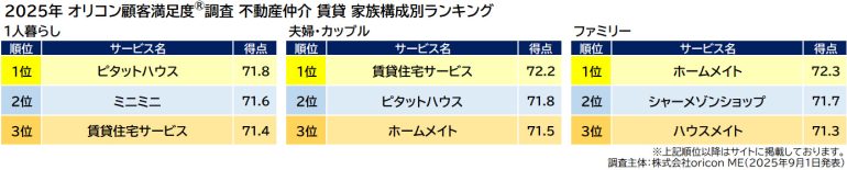 家族構成別ランキング…「1人暮らし」1位は【ピタットハウス】、「夫婦・カップル」1位は【賃貸住宅サービス】、「ファミリー」1位は【ホームメイト】