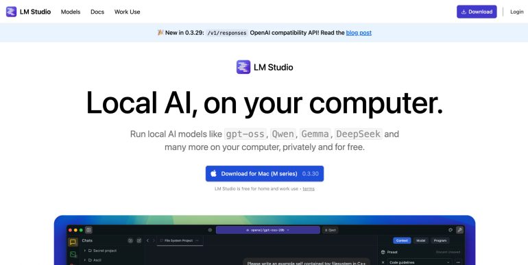 まずはLM StudioのWebサイトへアクセスして、ツールをインストールします。