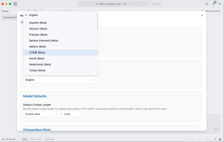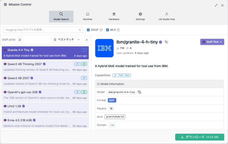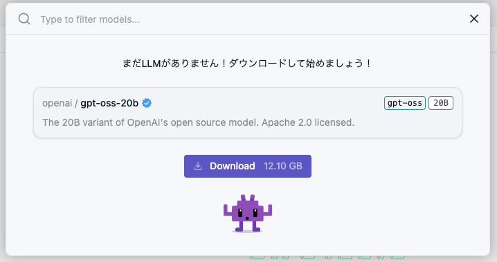 インストール直後はLLM(大規模言語モデル)が一つも入っていないので、まずは何かモデルを入れないとチャットができません。私の環境では「gpt-oss-20b」というモデルがおすすめされてきました。「gpt-oss-20b」は、ChatGPTの開発元であるOpenAIが提供しているオープンソースのLLMで、これを使えば、おそらくChatGPTと似たような反応が得られるはず。万人向けではありますが、スペックの低いパソコンだと動作が遅かったりすることもあるので、今回はもう少し軽快に動くモデルを使ってみることにしました。