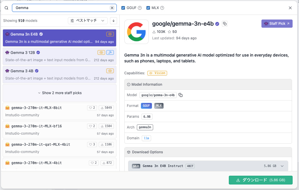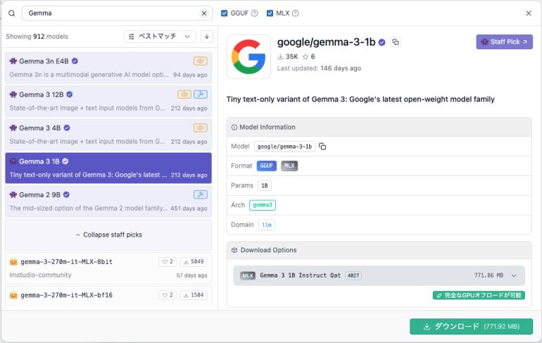 「Gemma」にも複数のバージョンがありますが、個人的には「Show 2 more staff picks」部分を開いて表示される「Gemma 3 1B」というモデルが軽量でおすすめです。