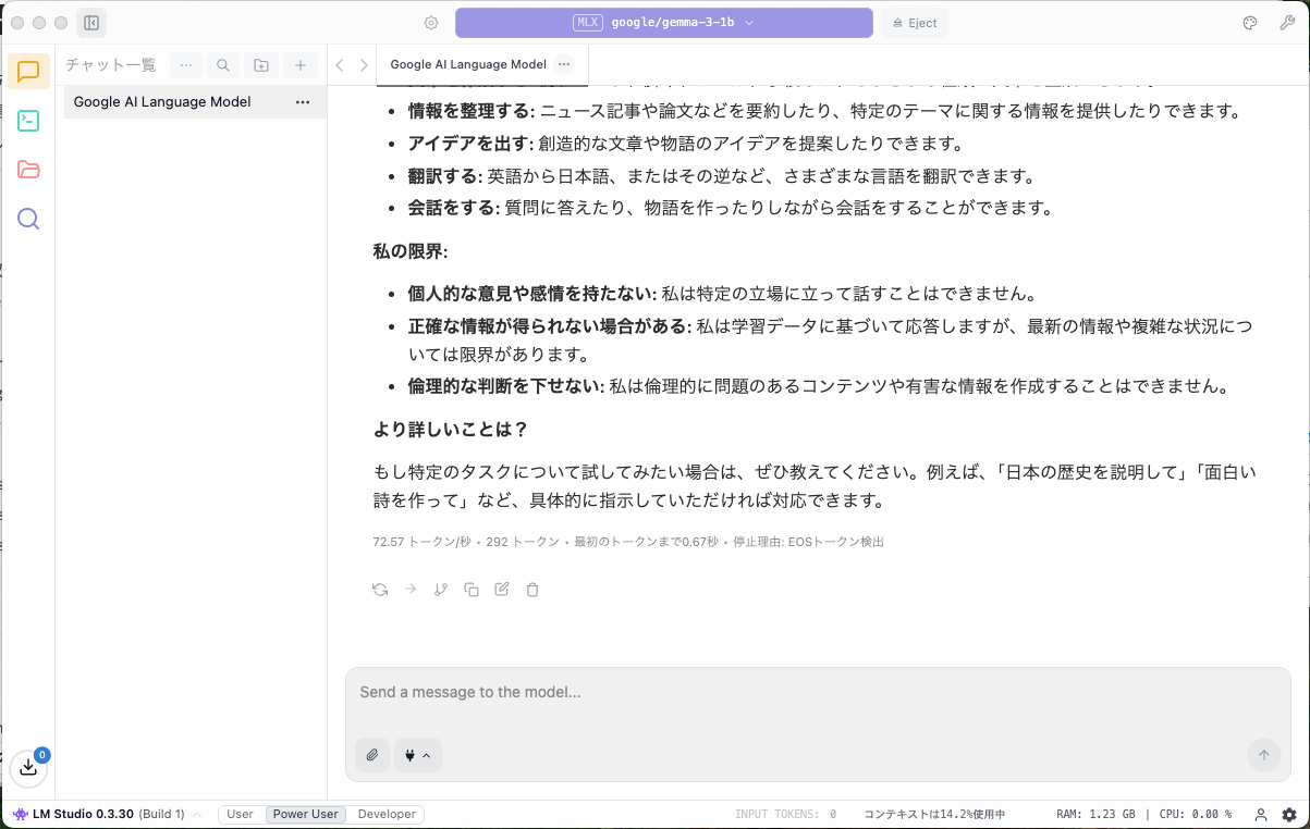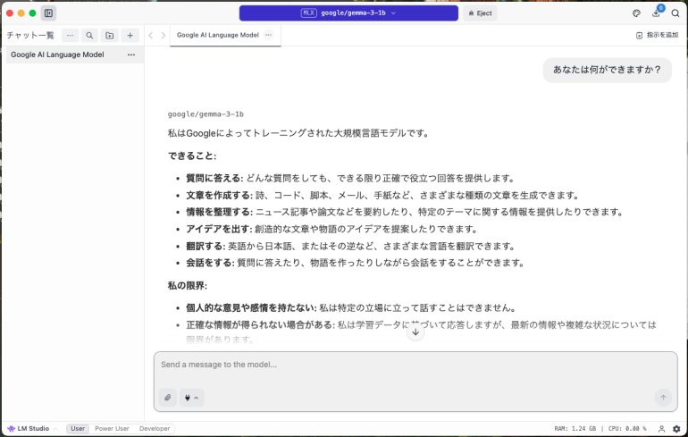 「あなたは何ができますか?」という質問に、できることや、できないことについて、分かりやすく整理された答えが返ってきました。普段使っているAIチャットツールに引けを取らない回答です。スピード感については、どうしてもマシンのスペックに依存しますが、ローカルにしては十分なスピードで生成された印象です。
