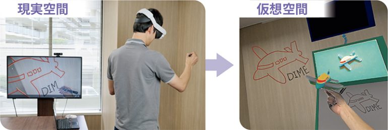左の写真は、VRゴーグルを装着し、飛行機の線画を仮想空間に描いているところ。右では、それを生成AIによってイラスト化し、さらに立体化させたものを、手に持って動かしている。