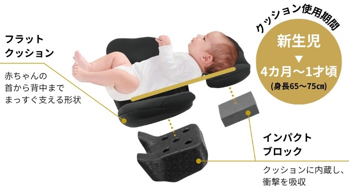 また、赤ちゃんの首から背中までをまっすぐ支える、新形状のインナークッション「フラットクッション」を搭載しているのも特長。新生児期から身長65~75cmまで長く使用できる(後向き装着時のみ)ので、体格や成長に合わせて外すタイミングを選ぶことが可能だ。