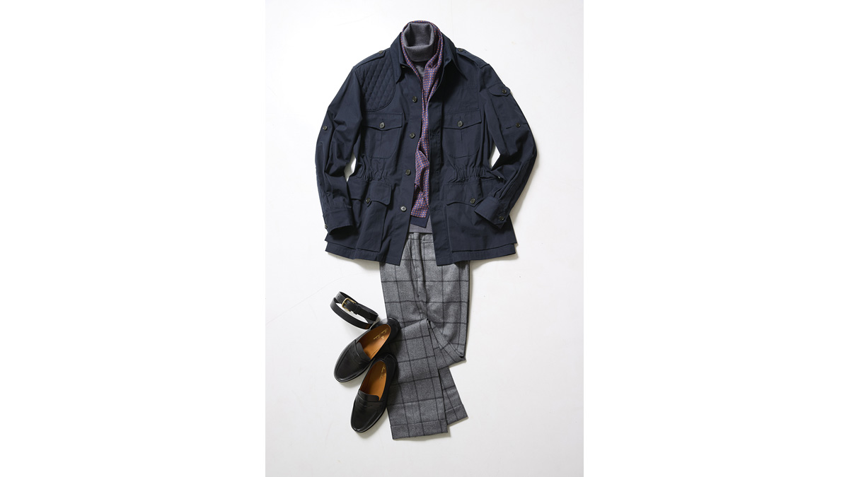 ブレザー感覚でグレーウールパンツと合わせれば、アメリカン・トラディショナルの上品さも漂う大人のカジュアルスタイルに。タートルネックやシルクのスカーフで首元を温めれば、冬場まで活用する。