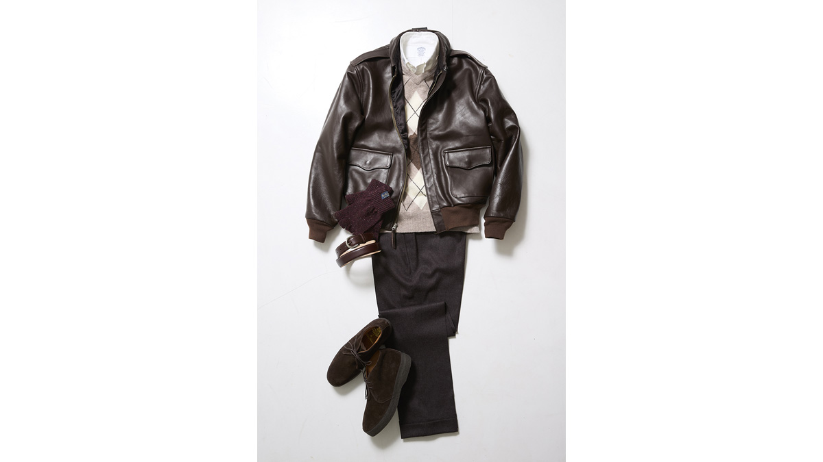 タフなフライトジャケットを上品に着こなすポイントは、シックな色使いに徹すること。トップスはブラウン系のアーガイルニットを合わせてトーン・オン・トーンに。