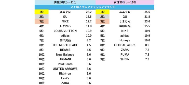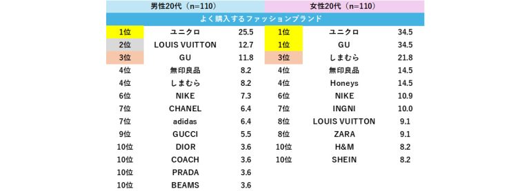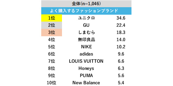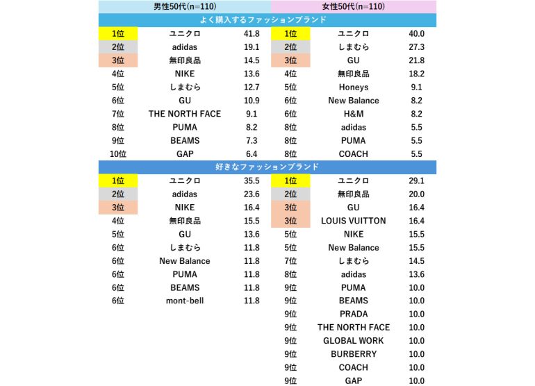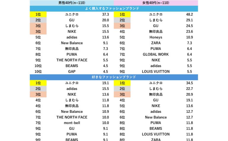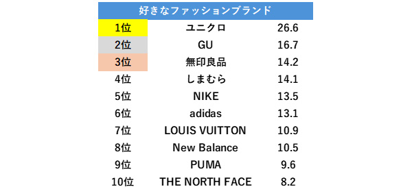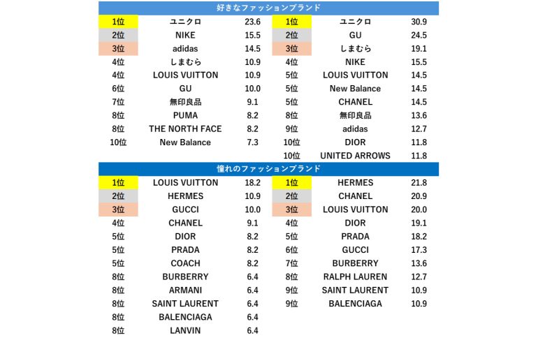 「ユニクロ」が全ての性年代で「好きなファッションブランド」1位!憧れのファッションブランドではハイブランドが並ぶ