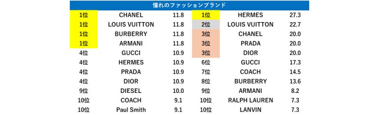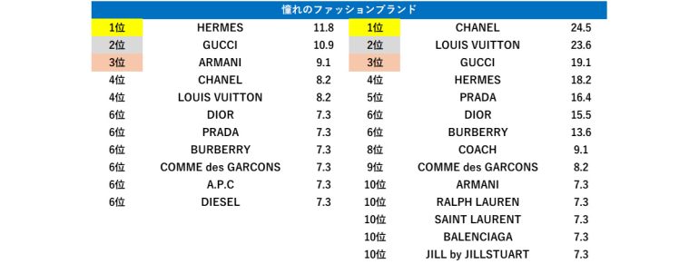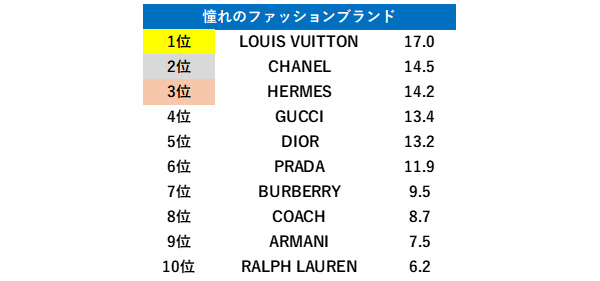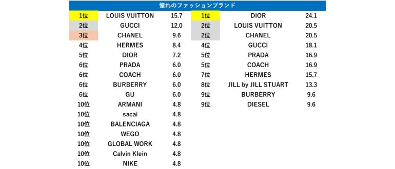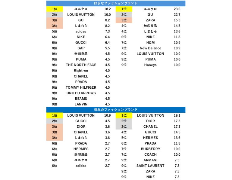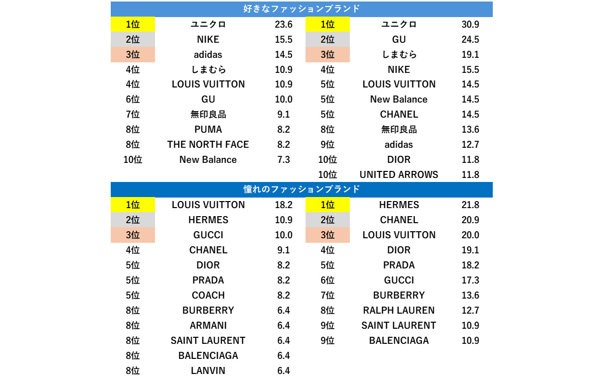 一方、「憧れのファッションブランド」ではハイブランドの名が並び、現実的な購買ブランドと理想のブランドのギャップがうかがえる結果となった。