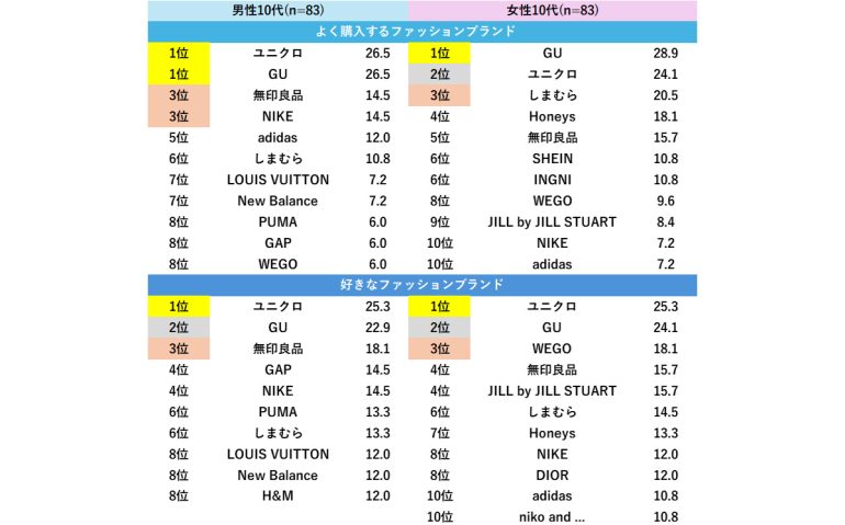 「よく購入するファッションブランド」については、全体で「ユニクロ」が34.6%で1位、「GU」が22.4%で2位となった。また「好きなファッションブランド」は「ユニクロ」が26.6%で1位、「GU」が16.7%で2位という結果に。