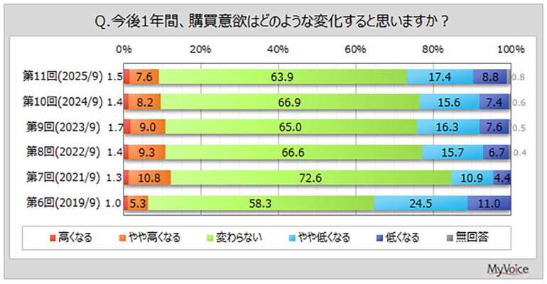 今後1年間の購買意欲は高くなる傾向