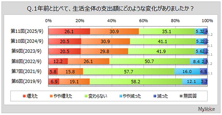物価上昇を受けて昇給をする企業も増えているようだが、消費者の購入意欲などに変化はあるのだろうか。さまざまな調査やAI分析サービスなどを展開するマイボイスコムは、11回目となる「消費意識」に関するインターネット調査を実施した。購買意欲や消費に関する考え方などについての調査では、1年前より生活全体の支出額が増えたと回答した人が6割弱と、2024年の調査と比較して増加していたという。