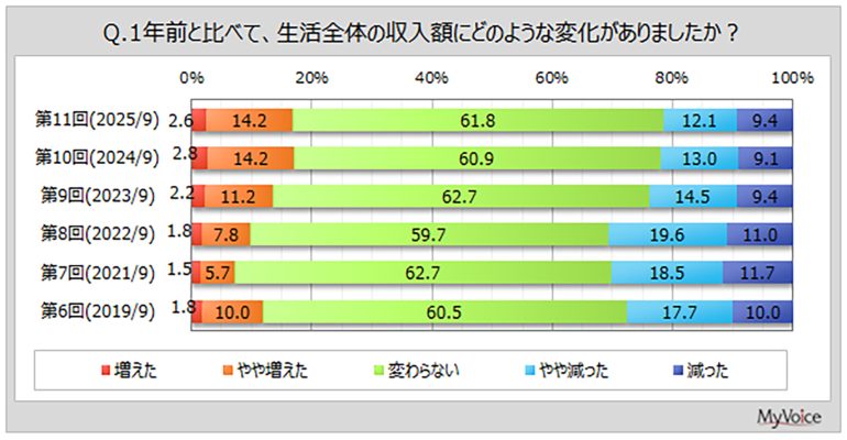 1年前より生活全体の収入額については、「増えた」と「やや増えた」を合わせて2割弱の人が増えたと回答している。減った人(「減った」「やや減った」の合計)は2割強で、「変わらない」が6割強だった。世代では、若年層では増えた人の比率が高く、男性60代では減った人の比率がやや高くなっていたという。